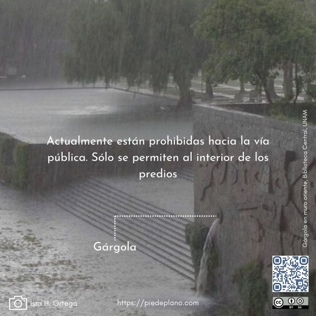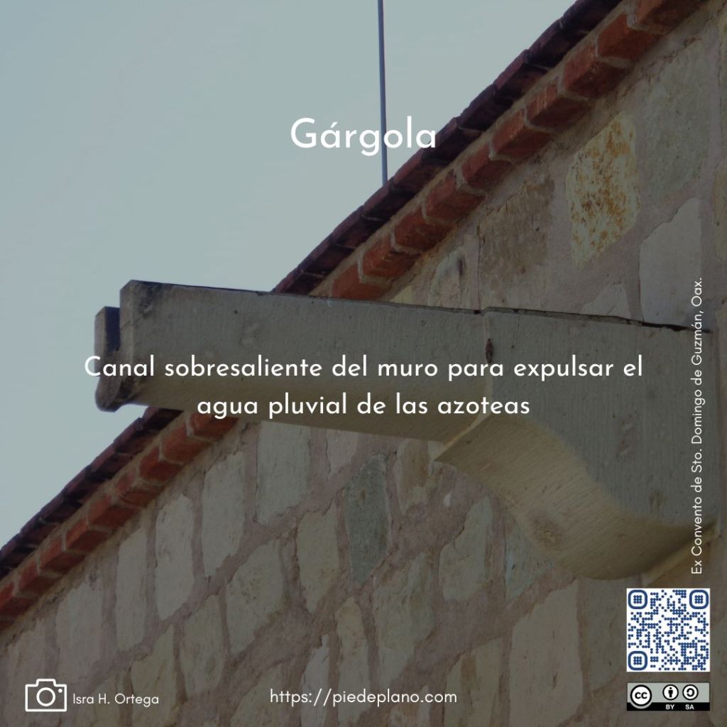 Canal sobresaliente del extremo superior de los muros para expulsar el agua pluvial de las azoteas. Hasta principios del Siglo XX se permitía su uso hacia la vía pública, pero actualmente están prohibidas así y sólo se permiten al interior de los predios, pues sobre la banqueta, las caídas de agua impiden el libre paso peatonal.