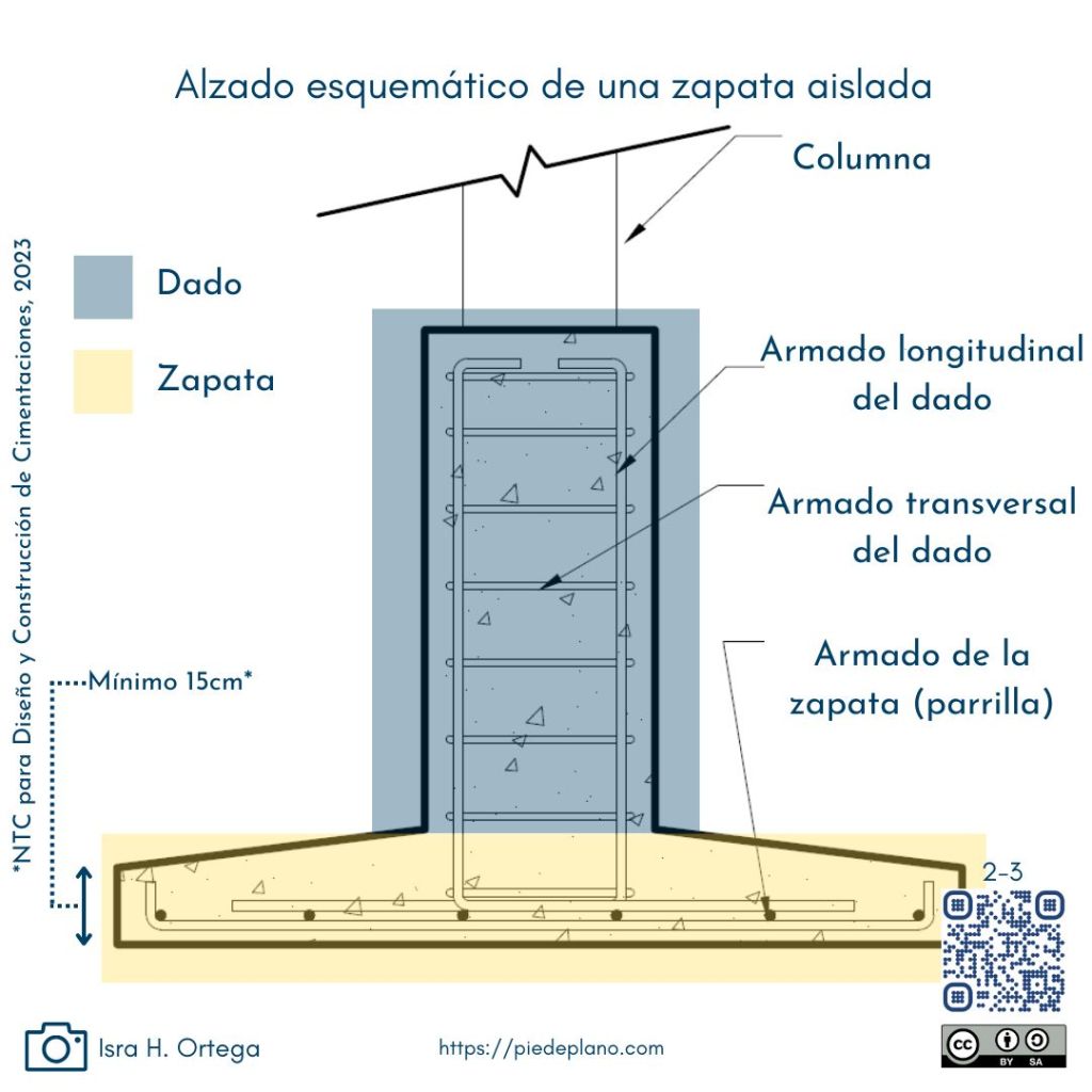Cimentación de tipo superficial elaborada con concreto armado. Por lo regular es de forma cuadrada. Reciben el peso de las columnas mediante un componente denominado «dado». La zapata en sí es la base que recibe todo el peso y lo transmite al terreno.