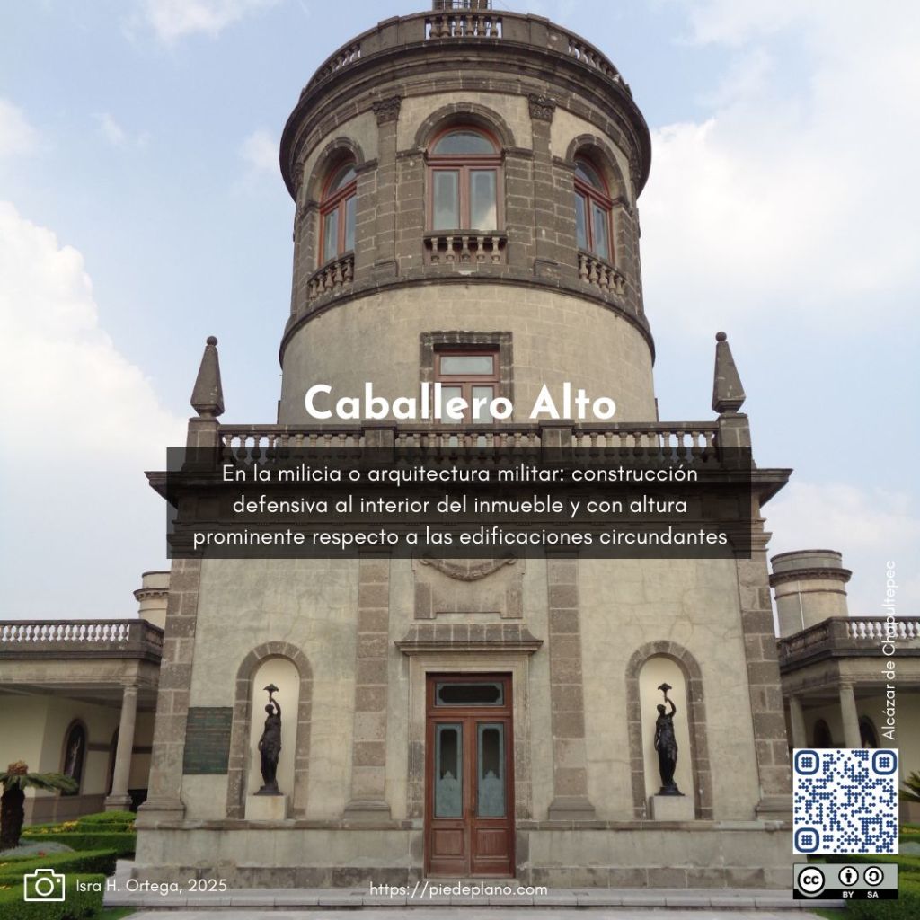 En la milicia o arquitectura militar: construcción defensiva al interior del inmueble y con altura prominente respecto a las circundantes, pues se concebían como puntos de observación. Actualmente el término «Caballero Alto» está en desuso.