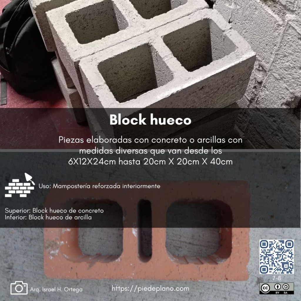 Por lo regular las piezas más pequeñas se elaboran con arcillas y las más grandes con concreto. Se utilizan para mampostería reforzada interiormente.