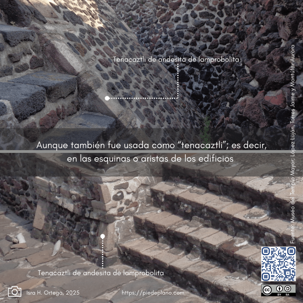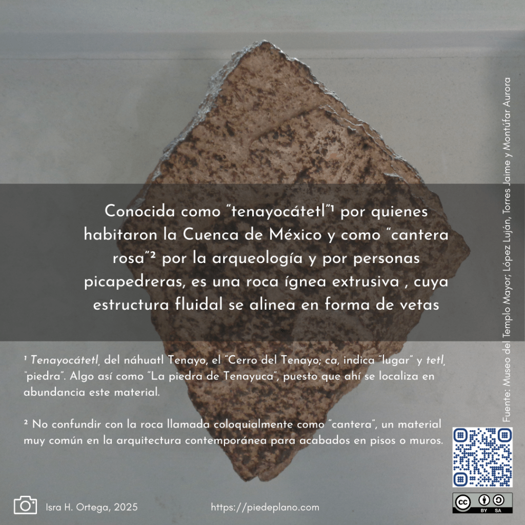 Este material es una roca ígnea extrusiva, cuya estructura fluidal se alinea en forma de vetas como producto del alineamiento de los minerales cuando la lava está en movimiento y comienza a solidificarse, lo que favorece su corte en planos para la obtención de losetas, haciendo muy común su uso en pisos y huellas de escalones, entre otros; aunque también fue usada como “tenacaztli”; es decir, en las esquinas o aristas de los edificios.