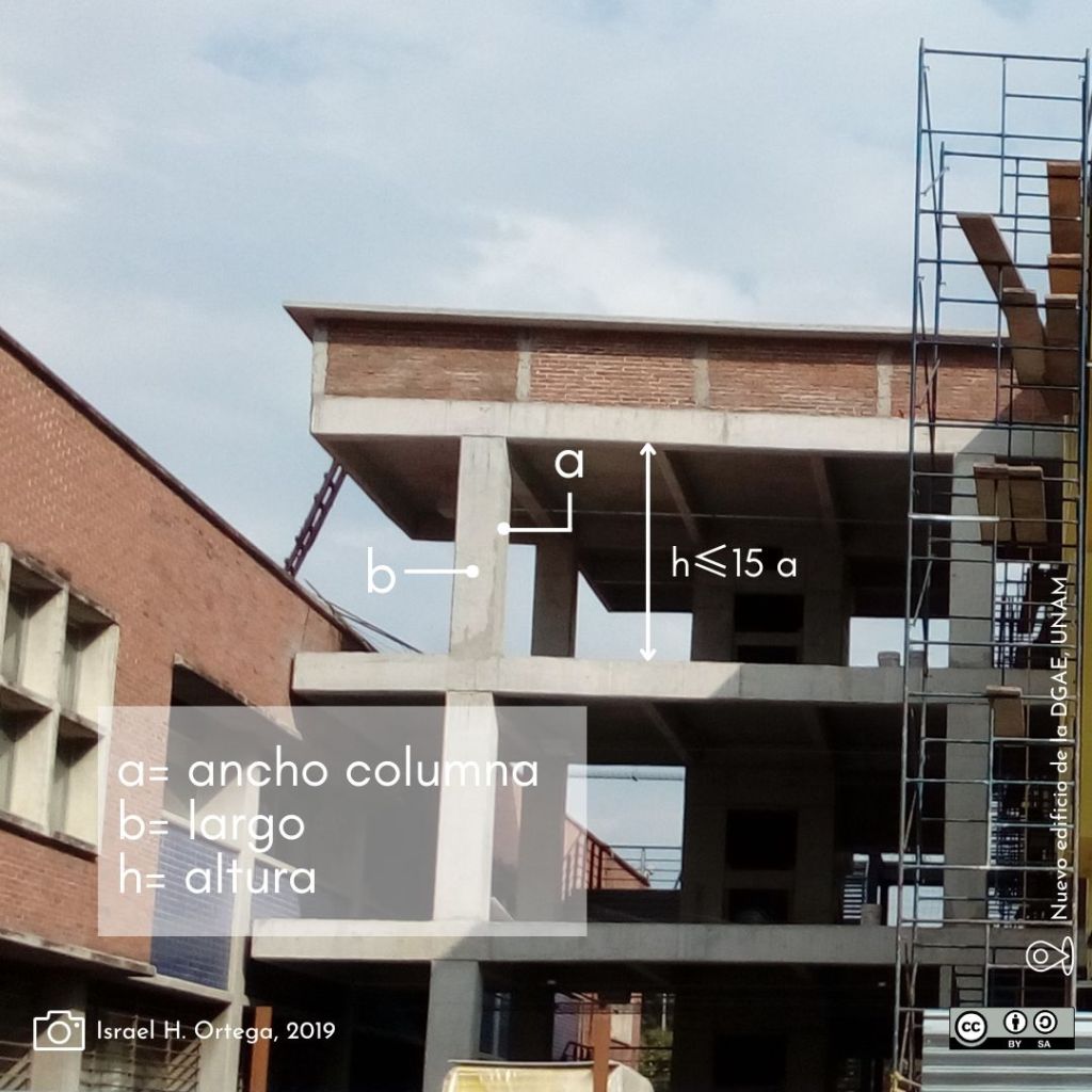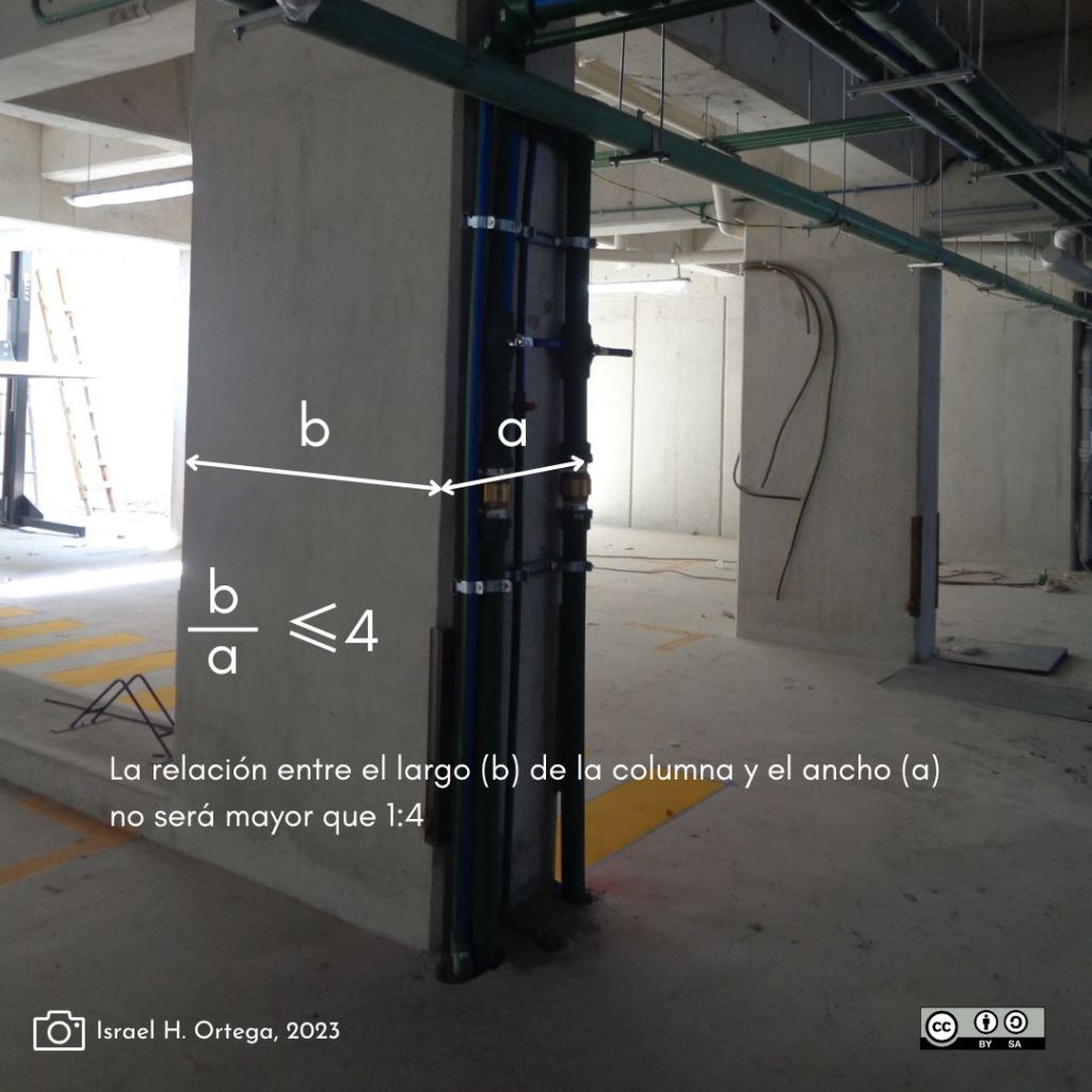 Vista en sección transversal, la relación del lado más largo entre el lado más corto, no debe exceder de 4 veces. Es decir, si una columna mide en su lado corto 30cm, lo máximo que podrá tener de largo serán 120cm (30cmX120cm).