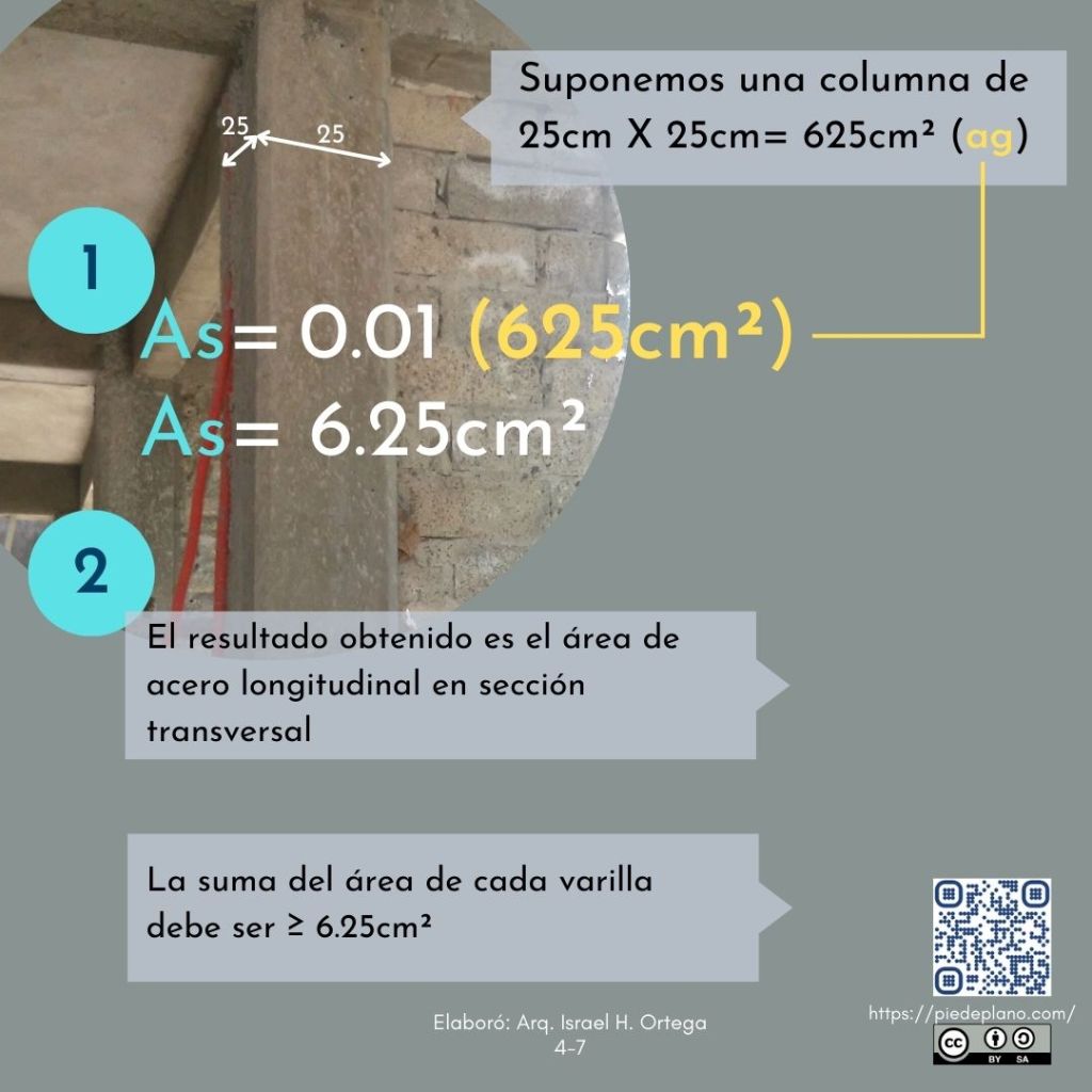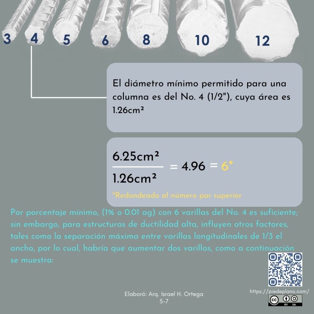 6.25cm² es el área mínima que deben sumar las varillas longitudinales; para ello, partiendo de que el diámetro más pequeño permitido para el armado de columnas es el No. 4 o ½” cuya área = 1.26cm²
