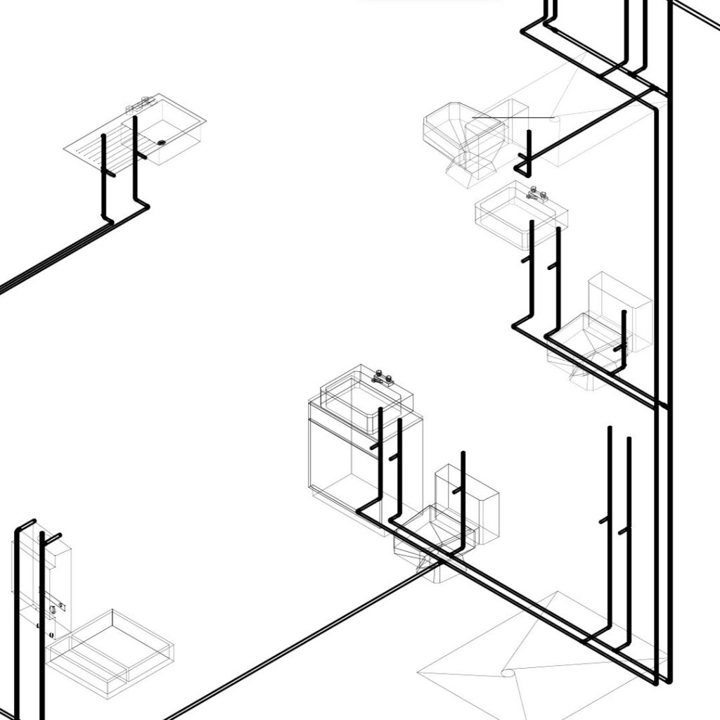 En las siguientes imágenes comparativas se muestra un pequeño núcleo sanitario con taza de baño, área de regadera y lavabo. En la imagen de la izquierda la tubería roja conduce agua caliente en tanto que la azul, corresponde al agua fría.
