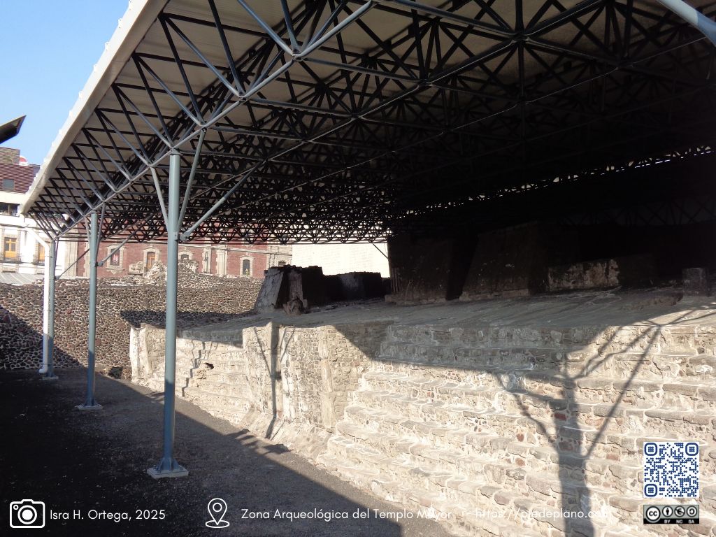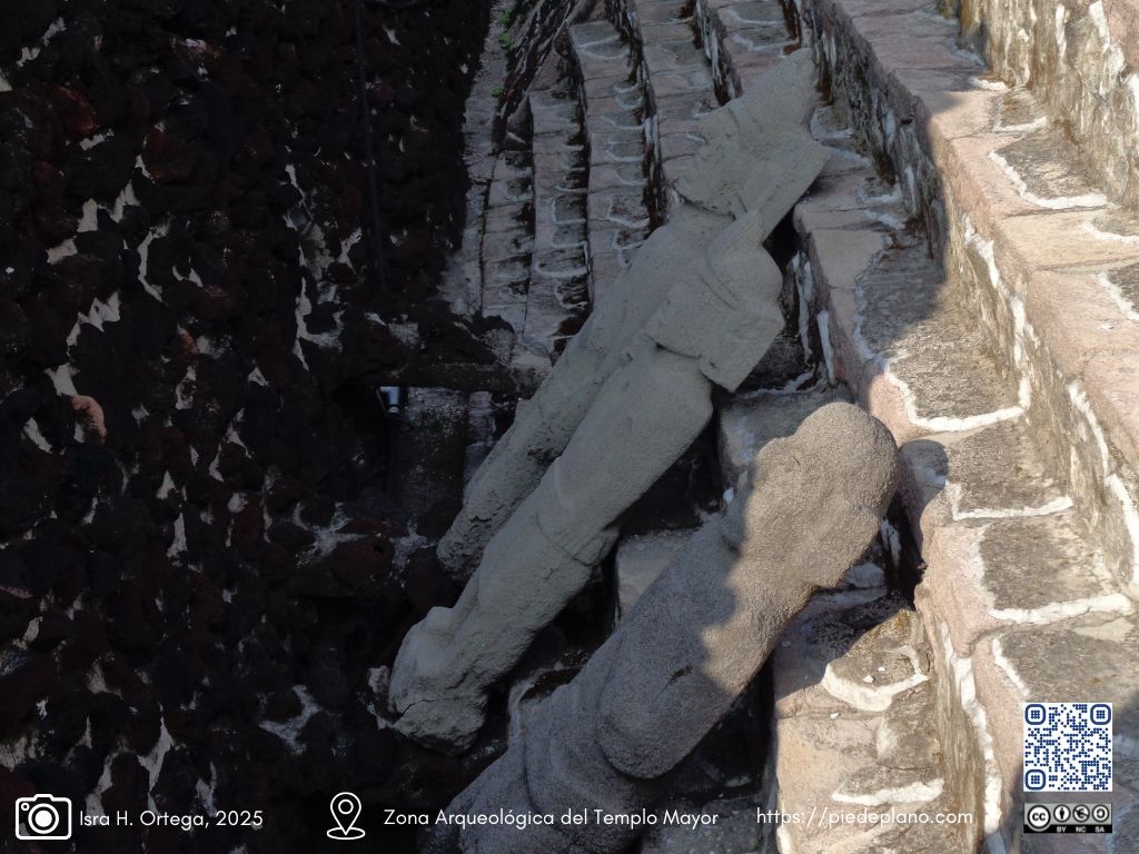 También es posible identificar parte de la escalera al frente de la plataforma con alfardas bastante robustas con forma de talud en su base y, marcadas con unas molduras horizontales, un segundo tramo superior con una cara menormente inclinada (escarpio). Dicha escalinata se puede apreciar desde la entrada general al Museo y Zona Arqueológica del Templo Mayor, pues se encuentra pasando los torniquetes de acceso, a espaldas de la maqueta reconstructiva del Templo Mayor.