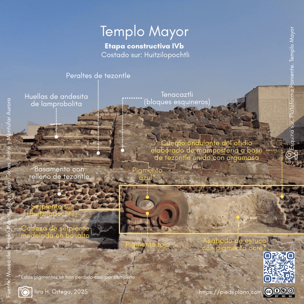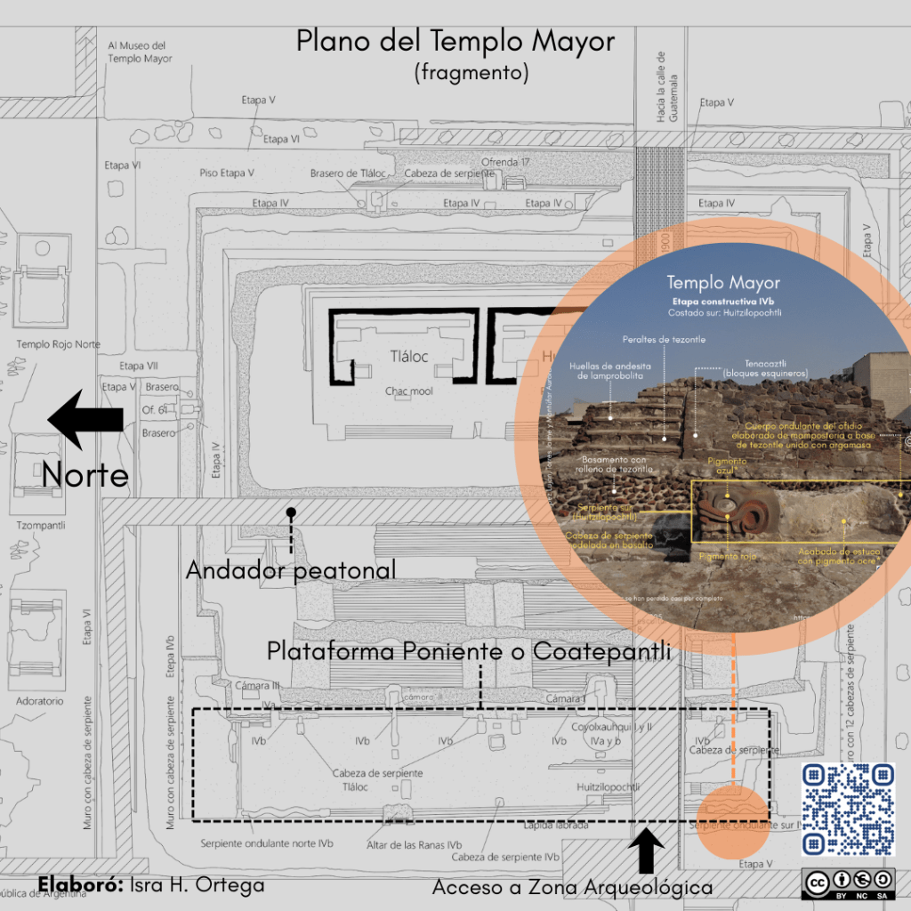 El plano digital ha sido elaborado con base en el libro Obras Maestras del Templo Mayor (la bibliografía completa se encuentra al final de esta publicación), el cual ha sido complementado con imágenes satelitales de Google Maps y fotografías personales de la dicha zona arqueológica. Su uso es meramente académico.