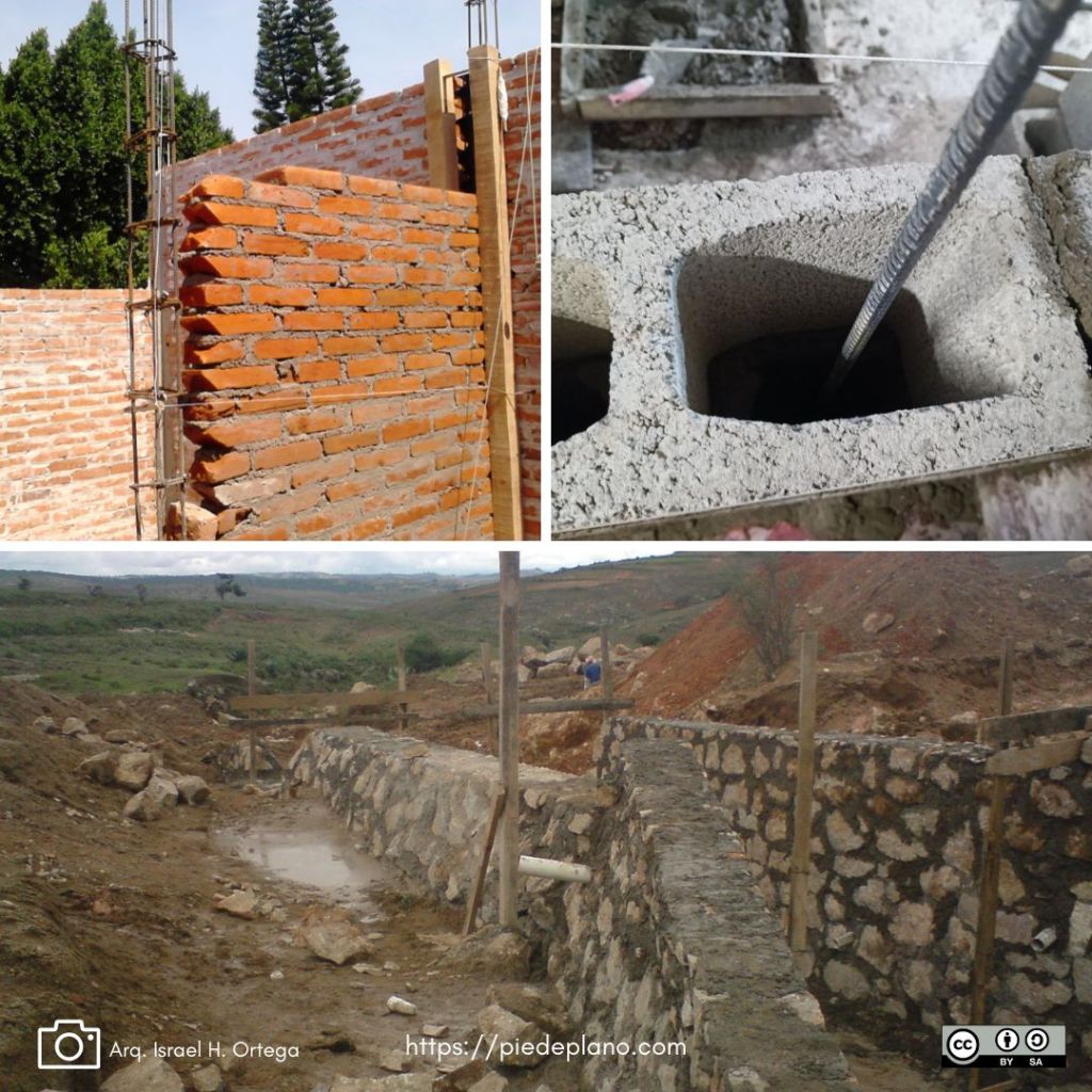Sistema constructivo a base de muros elaborados con piezas artificiales huecas, reforzadas en su interior de manera equidistante, tanto horizontal como verticalmente, con barras corrugadas y concreto.