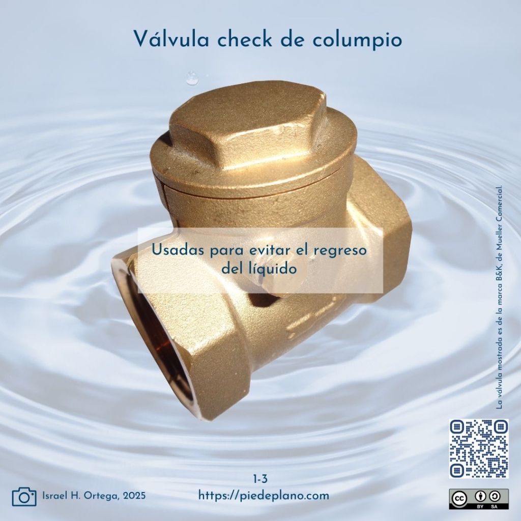 Las válvulas check son también conocidas como válvulas antirretorno, pues la circulación de los líquidos en su interior es en un sólo sentido. Se utilizan en aquellos lugares donde se quiera evitar que el agua se regrese.